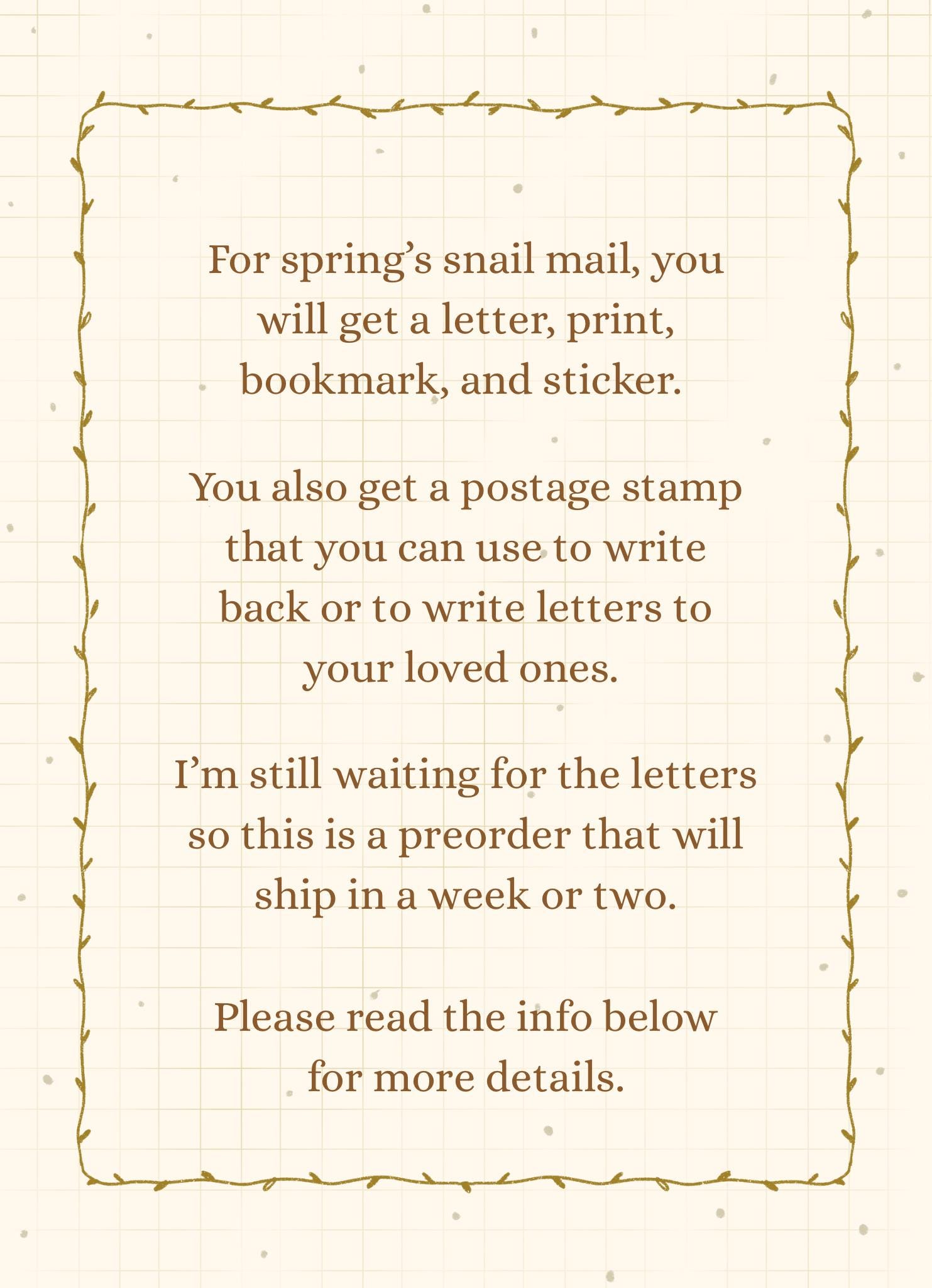 So for each season, you will get a letter with at least 3 other bookish items. For spring’s snail mail, you will get a letter, a 5 x 7 print, a bookmark, and sticker.